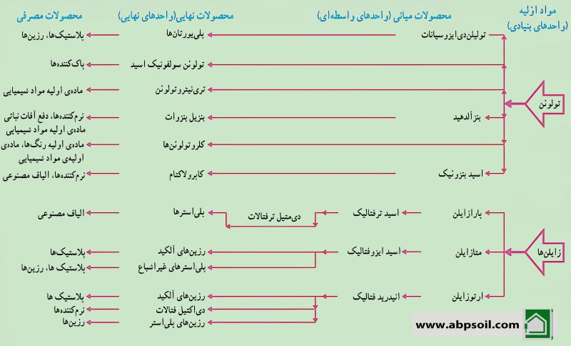 در شکلهای زیر مسیر تولید محصولات مصرفی ماده اولیه بنزن، تولوئن و زایلن را نشان میدهد.