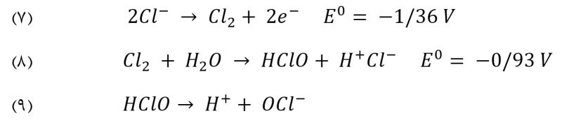 همچنین در صورتیکه کلر در سیستم موجود باشد و پتانسیل آند نیز تا حد کافی بالا باشد، واکنش های زیر در سلول انعقاد و شناورسازی الکتروشیمیایی روی می دهند: