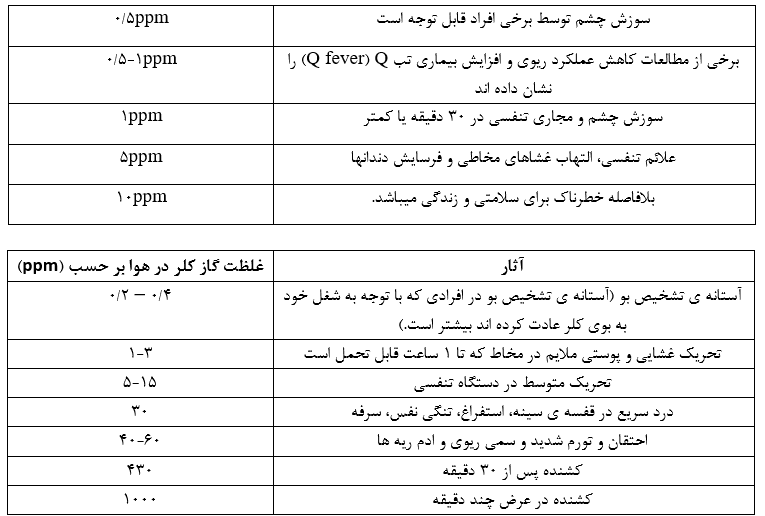 جداول زیر، آستانه های قرار گرفتن در معرض کلر و واکنش های گزارش شده در انسان را نمایش می دهند: